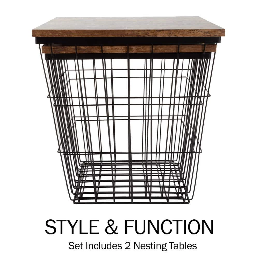 This set of End Tables with Storage by Lavish Home have slightly varied heights so they can nest inside each other as needed, offering functional storage in homes large and small, as well as in studios, children’s rooms, apartments, or dorm rooms. Each square farmhouse table is made with a metal wire base and has a removeable MDF lid with a dark brown woodgrain melamine finish that can hold up to 90lbs for the large table, and 50lbs for the small storage table. This all-in-one sofa side table set with storage baskets can be used as tray tables, decorative baskets, or storage bins. The rustic look and mixed media style of these farmhouse side tables are sure to complement an array of modern decor styles in any room of the home.