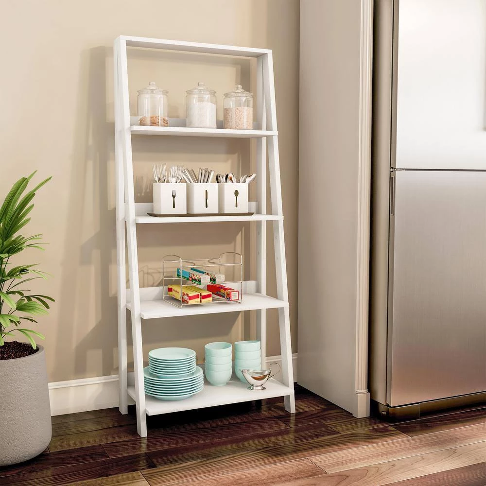 The 4-Shelf Ladder Bookshelf by Lavish Home is perfect for all your decorating and storage needs in your living room, bathroom, bedroom, office, or kitchen. This free-standing shelving unit is the perfect platform for displaying books, knick-knacks, photo frames or other home decor. Constructed of white painted manufactured wood, this stylish bookcase features a straight back for added stability when placed against a wall and a descending angled design for a space saving footprint in any room, big or small. With ample shelving space to organize and neatly display your belongings, the leaning look of this bookshelf is sure to turn empty wall space into a focal point that is both attractive and purposeful for years to come.