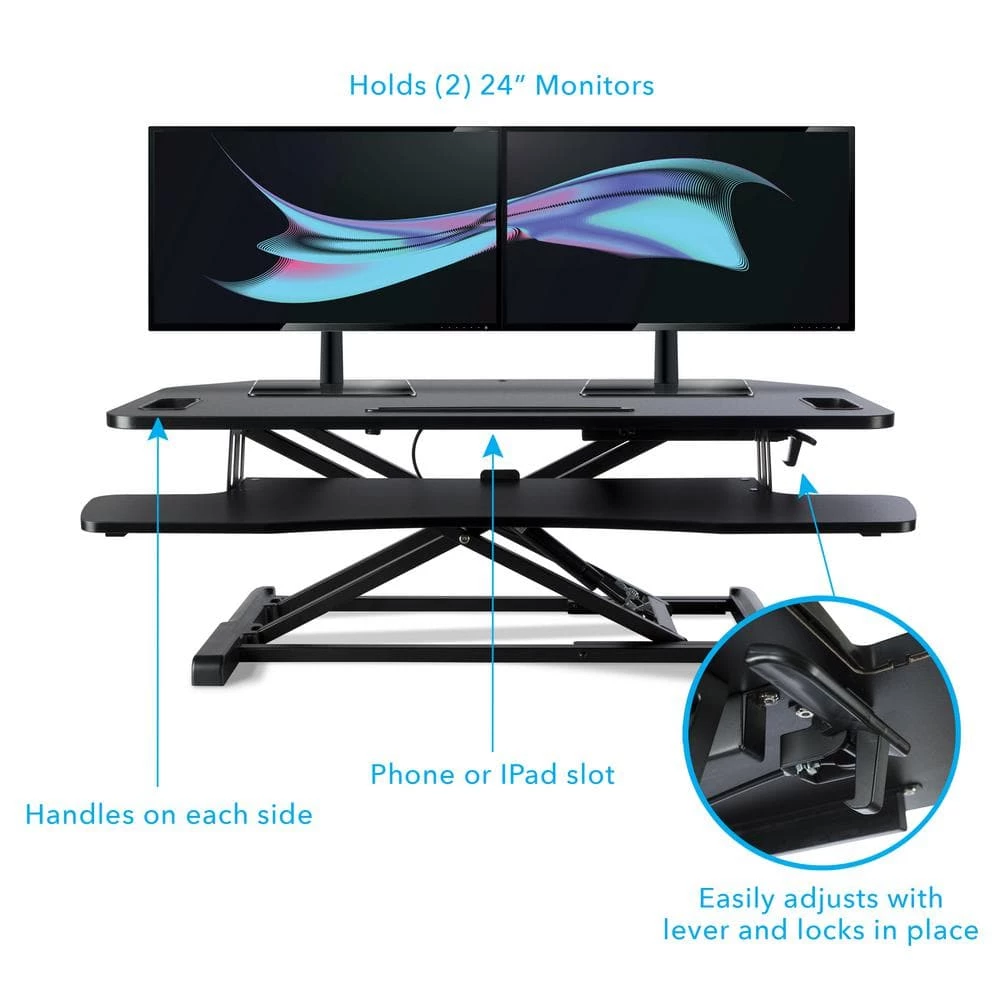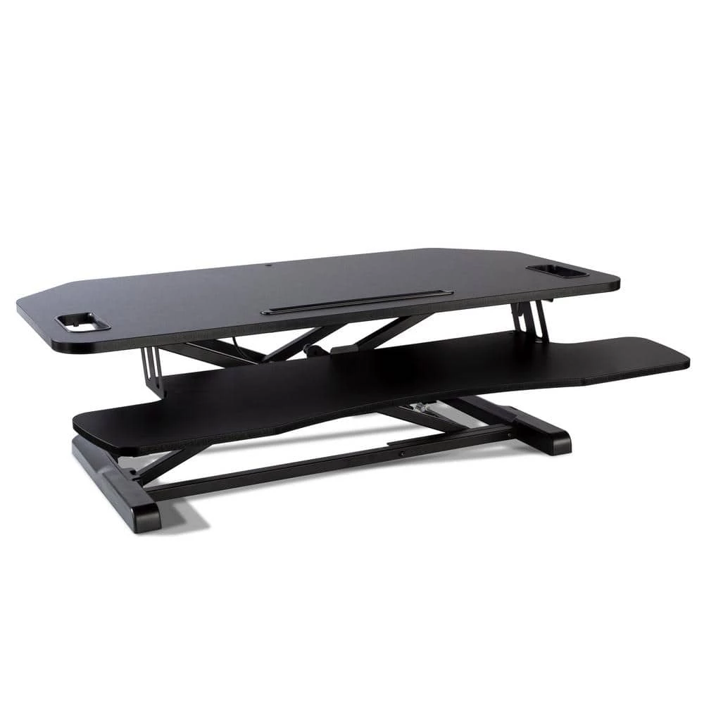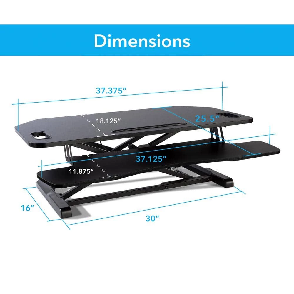 If you spend most of the day in a chair, you know there must be a more active way to be productive at work. The Atlantic Extra-large Standing Gas Spring Desk Converter is designed so you can stand after quickly adjusting and locking your desk height. Adding only 4.5 in. height to your 37.375 in. by 18.125 in. work surface when sitting, the desk converter continuously elevates up to 19.5 in. when you stand. Theres room for dual monitors, a tray for your smart phone or tablet, a wide keyboard tray, room for a mouse pad on either side and cable management clips to keep your cables organized. Handles on both sides make it easy to adjust. The desk converter comes mostly assembled just attach the keyboard tray and protective rubber feet. The sturdy tubular steel frame and lift mechanism supports up to 33 lbs., is built to last and is backed by a one-year warranty with knowledgeable domestic customer support if you need it.
