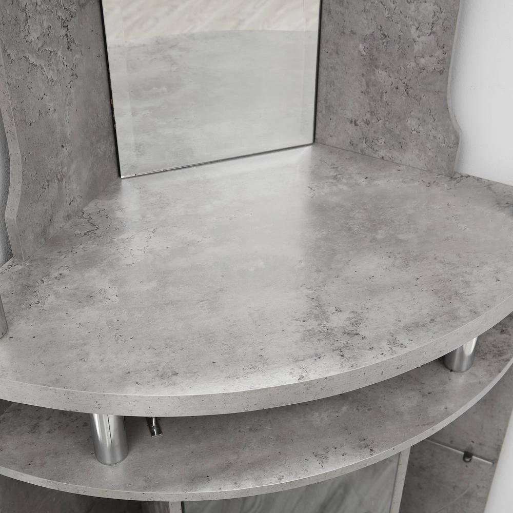 Your next get-together is going to be made even better with the Home Source Corner Bar Unit. It’s an all inclusive corner bar unit in a concrete finished hardwood frame. You won’t have to worry about where your stemware is going to go with the rack on the top and middle of this unit. Reflective mirrored panels are set behind these racks. The middle counter space is perfect for bottles or more wine glasses. Two silver chrome bars add sturdy support to the top of the unit. The base of this unit features one clear glass door for the middle shelves and two side shelves for any other items you need to store. Make this your one stop shop for setting up hor’dourves plates and serving drinks. Store bottles in the middle wine rack that can house four bottles.