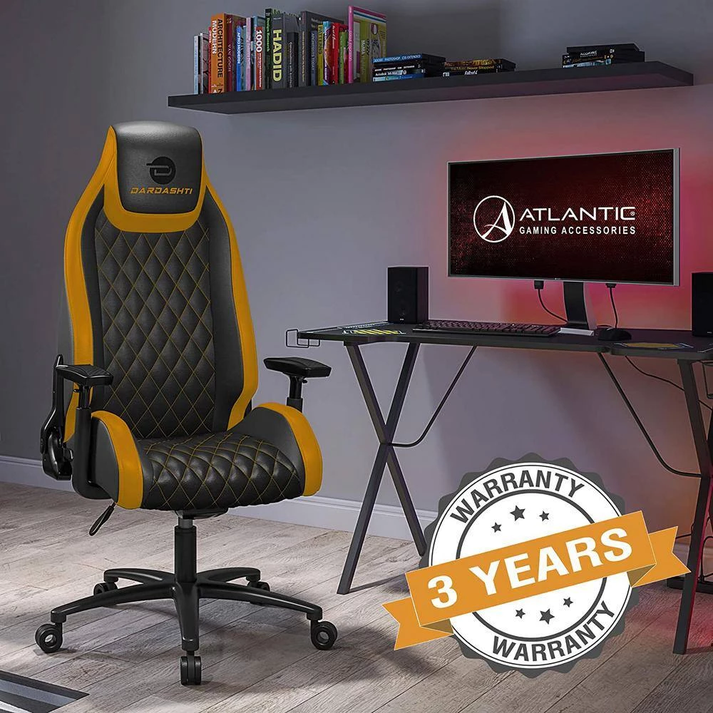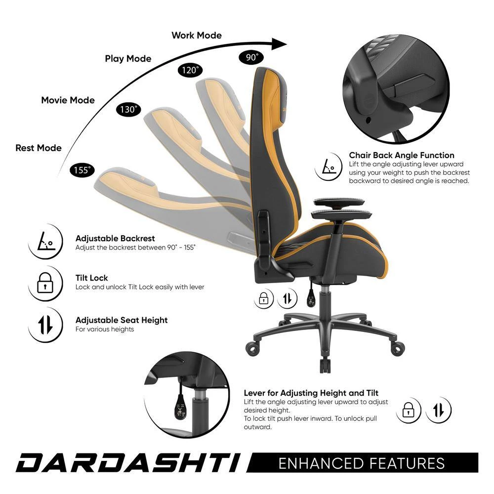 Meet the Dardashti Gaming Chair. This is a commercial grade next-gen ergonomic gaming chair. Inspired by today’s high-end performance vehicles, the goal was to provide the highest design value encompassing performance and aesthetics. The result is a comfortable, durable gaming chair designed for long gaming sessions that is built to last and backed by a three-year warranty. This chair meets BIFMA X5.1 commercial furniture test standards.The solid steel frame sits atop a nylon five-star performance base supported by a Class 4 hydraulic gas piston. Add sports car inspired cold-cure foam bucket seats meticulously covered with deluxe PU leather. Unlike entry level gaming chairs with pillows, we integrated a dynamic 2-in. lumbar curve support and an oversized headrest, both with cold-cure foam cushions. The eight-way, adjustable, cushioned arm rests are designed to provide long-term comfort. With four in. of travel, the armrests can be lowered out of the elbow zone or raised up for perfect support. Gamers can quickly recline up to 155° to relieve stress during long sessions. Designed to accommodate all users, back tension and chair height are adjustable.The chair aesthetics are striking from afar to close up, top to bottom or an all-around 360 view. Its geometric curves are inviting. The sporty seat and chair back are covered with deluxe PU leather accented with bold colored diamond stitching with matching carbon fiber accent bolsters and rear piping.