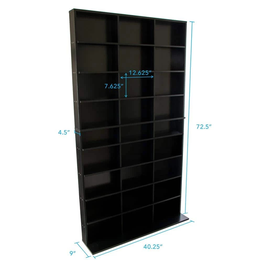 You have a large media collection and want to organize your movies, video games and music. The versatile atlantic media tower elite xl features 9-shelves, a wall anchor kit and storage for blue-ray, DVDs, CDs and games. The sturdy traditional design has new wider side panels, improved assembly, extended base and a black finish. Store up to 624 blu-ray or 528 DVDs or 837 CDs or a combination. Gamers can store 624 PS4 game cases. The tower measures 71. 15 in. H, 40 in. W and 9. 14 in. D. A wall anchor kit secures the tower to the wall.