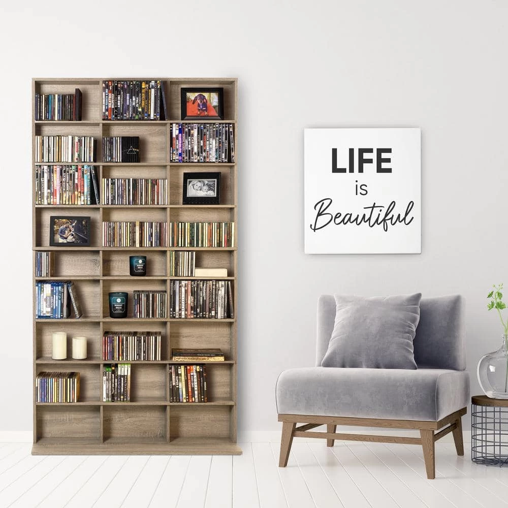 You have a large media collection and want to organize your movies, video games and music. The versatile Atlantic media tower Elite XL features 9-Shelves, a wall anchor kit and storage for Blu-Ray, DVDs, CDs and games. The sturdy traditional design has new wider side panels, improved assembly, extended base and a Weathered Oak finish. Store up to 624 Blu-ray or 528 DVDs or 837 CDs or a combination. Gamers can store 624 PS4 game cases. The tower measures 72.5 in. high, 40 in. wide and 9. 14 in. deep. A wall anchor kit secures the tower to the wall.