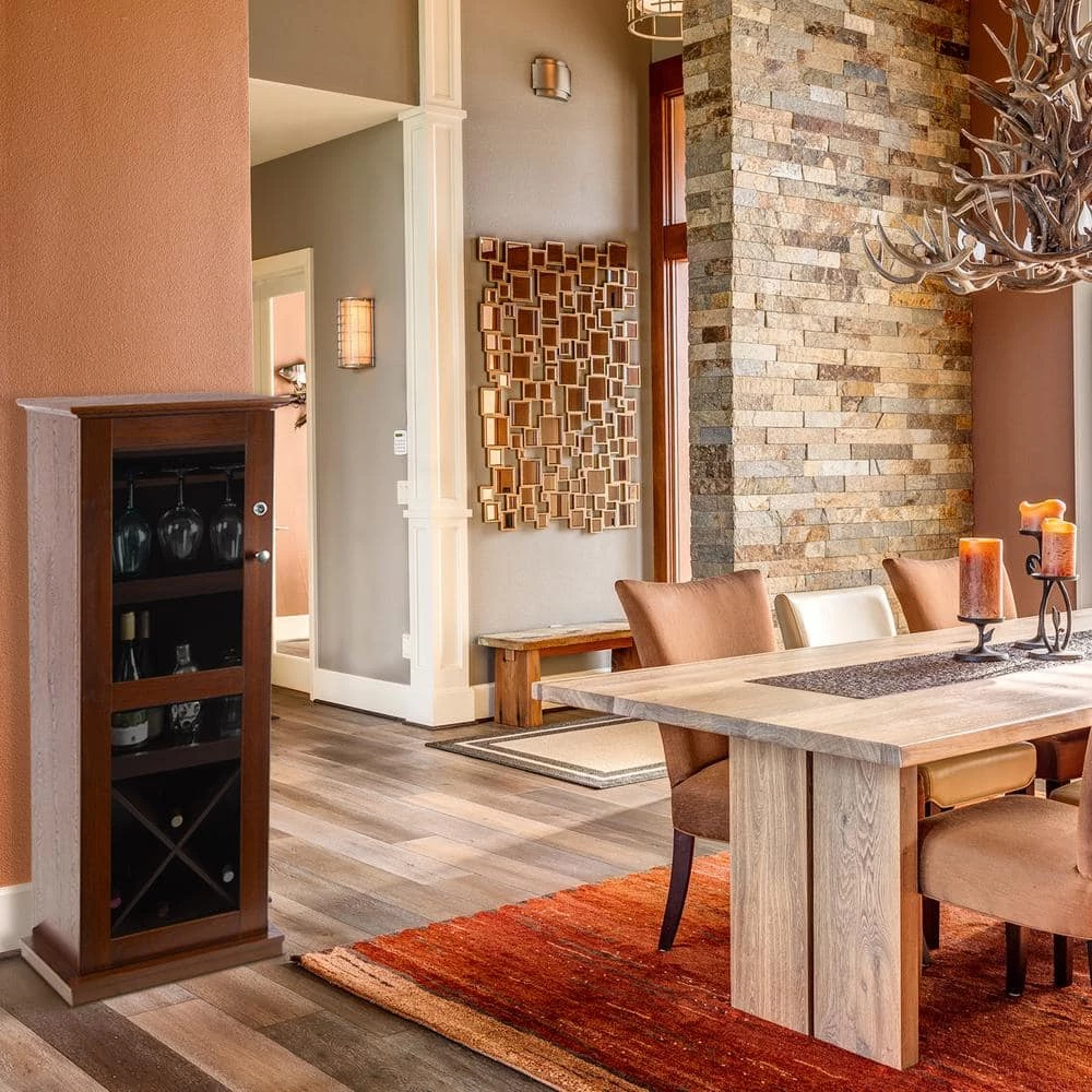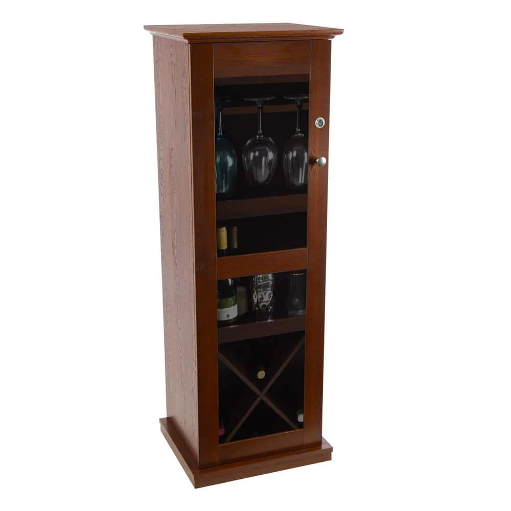 Youve always wanted to lock and organize your liquor while having easy access. Here is the versatile HERRIN Lockable Bar Cabinet with bar storage in a compact cabinet. Store up to 16 wine bottles in the X design rack, and keep 9 wine glasses close at hand. Organize your beer and hard liquor on its own shelf with inner dimensions of 13.1 x 14.1 x 12.75. The gliding accessories drawer is great for corkscrews, bottle openers and accoutrements. The traditional design and textured chestnut wood grain finish will complement most decors. You will appreciate the attention to detail with metal hardware, European hidden hinges, platform base, and crown molded top.