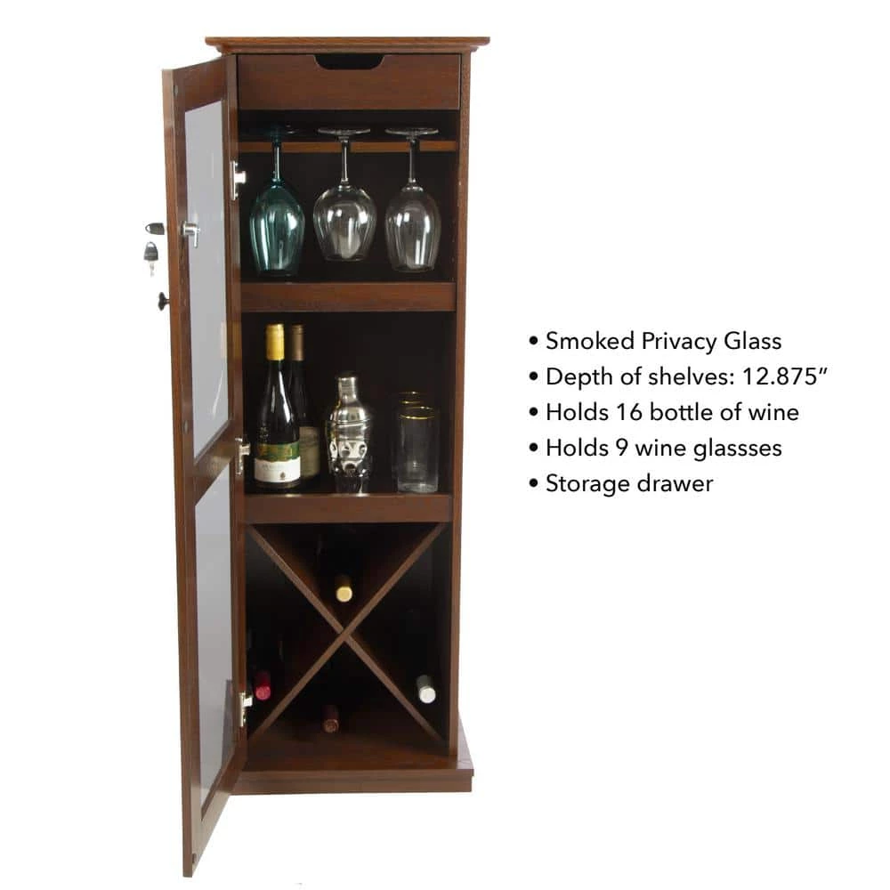 - Youve always wanted to lock and organize your liquor while having easy access, the versatile HERRIN lockable bar cabinet features storage for 9-wine glasses, 16-wine bottles, liquor bottles and accessories, the sturdy traditional design is equipped with tempered glass panes, European hinges, metal hardware, a platform base and crown molded top