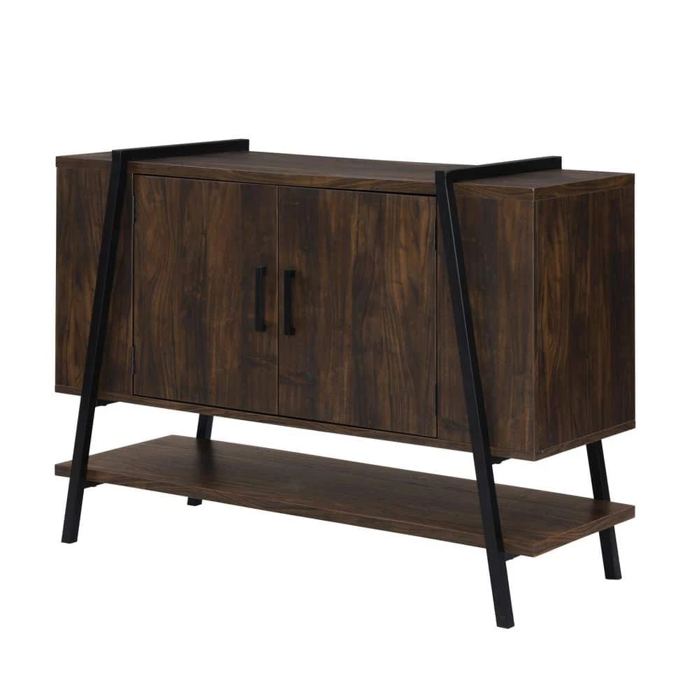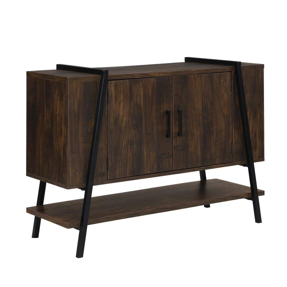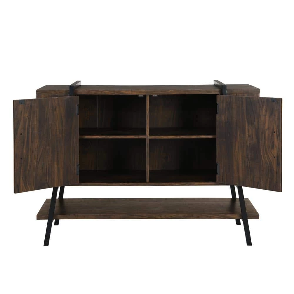 Complete your home decor with this stylish mid-century Server Cabinet with Pine Distressed Finish. This unit have metal decorative legs and double wood doors with knobs on each door, allowing easy access for entry. Inside the server there is a middle divider and a shelf for any other items you need to store. There is an open full-length wood shelf at the bottom of this unit. On top of the server you can showcase any beverage bottle or your favorite decor. There are endless possibilities with this unit to maximize your current space, regardless of its size. The mid-century server with a pine distressed finish gives ample storage while simultaneously keeping everything contained and out of sight.