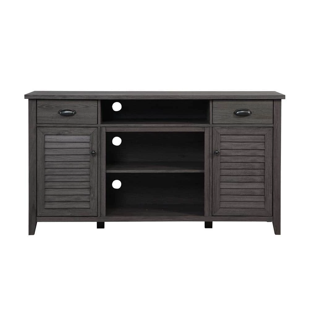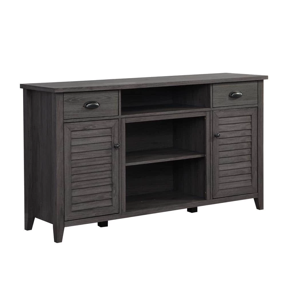 The 33″ wide Chelsea Peak Grey TV Stand is a must-have entertainment system for your home. At first glance, you can see this unit has a spacious top surface, two drawers, two cabinets, and open shelving in the center. Having a mix of open and closed features allows you to pick and choose what you want on display and what you would rather tuck away. The top surface is ideal for your choice of TV along with any additional decor to coordinate with your home. The drawers on either side would be perfect for remotes, smaller devices, and other miscellaneous items that need a home. Use the cabinets and open shelves for larger electronic consoles, games, magazines, books, and more. Both the drawers and cabinets have a mix of pulls and knobs to easily access the contents inside.
