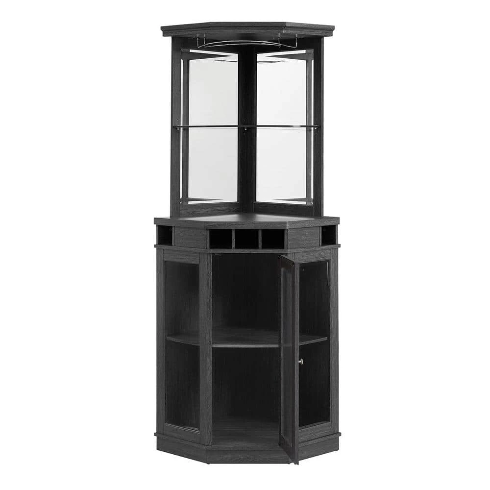 Your next get-together is going to be made even better with the Home Source Corner Bar Unit Charcoal. It’s an all inclusive corner bar unit in a charcoal finished hardwood frame. You won’t have to worry about where your stemware is going to go with the wrack on the top of this unit. Reflective mirrored panels are set behind the shelf. You can set more glasses or other accoutrements. The middle counter space is perfect for bottles or more wine glasses. The base of this unit features 3-clear glass doors and 2-shelves for any other items you need to store. Make this your 1-stop shop for setting up hor’dourves plates and serving drinks. Store bottles in the wine middle wine rack that can house 5-bottles.