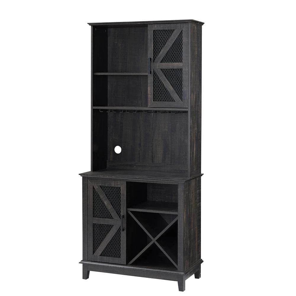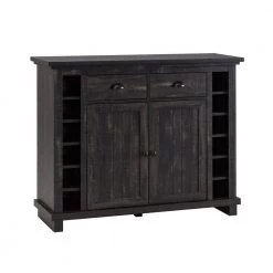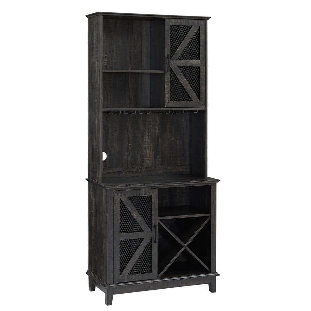 You will fall in love with the functional versatility the Charcoal Bar Cabinet adds to your space. This unit has a mix of open shelves and cabinets ideal for storing wine bottles and glasses, overflow of dishes, minimal decor and more. The open shelving and cabinetry design is mix-match on the top and bottom. Each cabinet has barnyard inspired doors with bar handles which not only enhances the overall design but makes for easy access. Behind each door is ample storage to keep items tucked away that you may not necessarily want on display. There is a built-in wine rack on the bottom great for additional beverage bottles. Directly in the center of the unit, below the top cabinet, there is a built-in fixture created to house your favorite wine glasses. The open shelf of the Charcoal Bar Cabinet is a spacious enough to mix and serve drinks, display your favorite decor, or even a microwave.