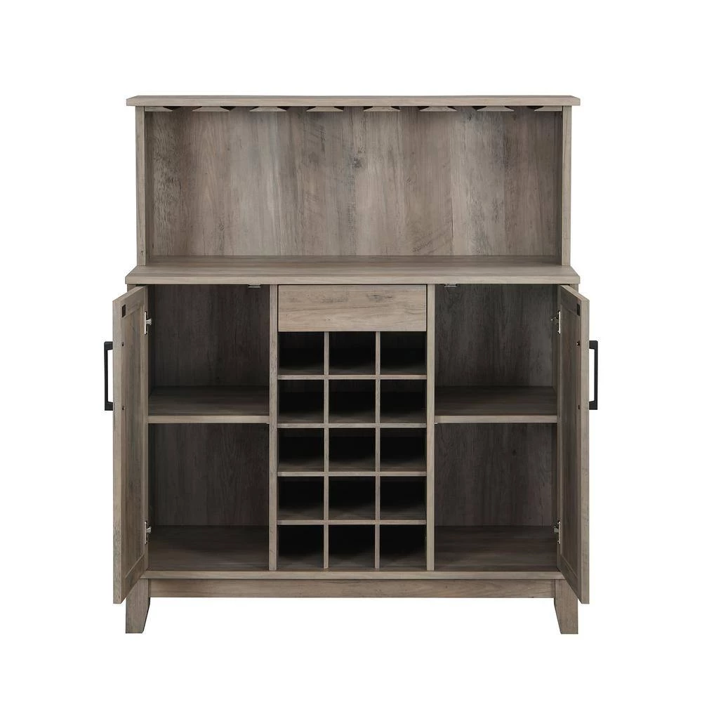 Add a stylish, versatile unit to your home with the addition of this Bar Cabinet with Wine Rack. The bottom of the unit has double door cabinetry with knobs on each door, allowing easy access for entry. In addition, you can store up to 15 wine bottles in the lower built-in wine rack. Directly in the center of the unit, there is a built-in fixture created to display your favorite wine glasses. The open shelf is great to showcase any additional beverage bottle, your favorite decor, and even a microwave. There are endless possibilities with this unit to maximize your current space, regardless of its size. The Grey Wash Bar Cabinet with Wine Storage gives ample storage while simultaneously keeping everything contained and out of sight.