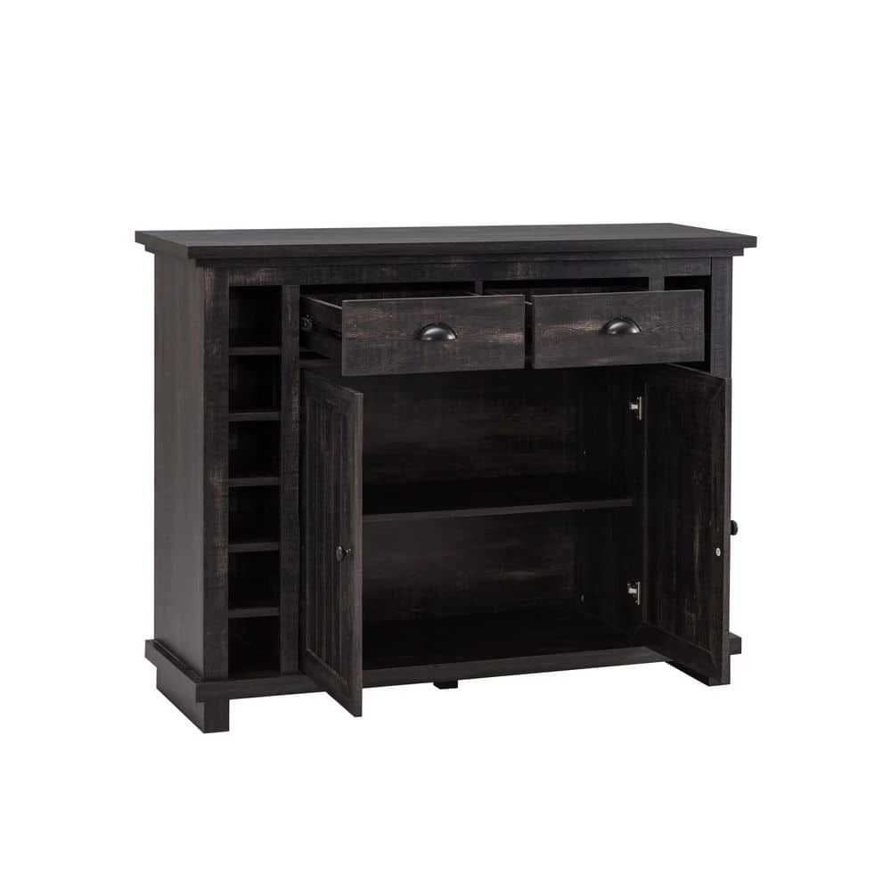 Elegance, practicality and style are the hallmarks of this bar cabinet, which can also be used as a server or sideboard. The beautifully designed wooden cabinets and drawers provide ample storage space. There are 2-7-bottle wine racks on the side to store your best wines. The spacious shelf is ideal for placing family photos and ornaments and is also great for a self-serve buffet.