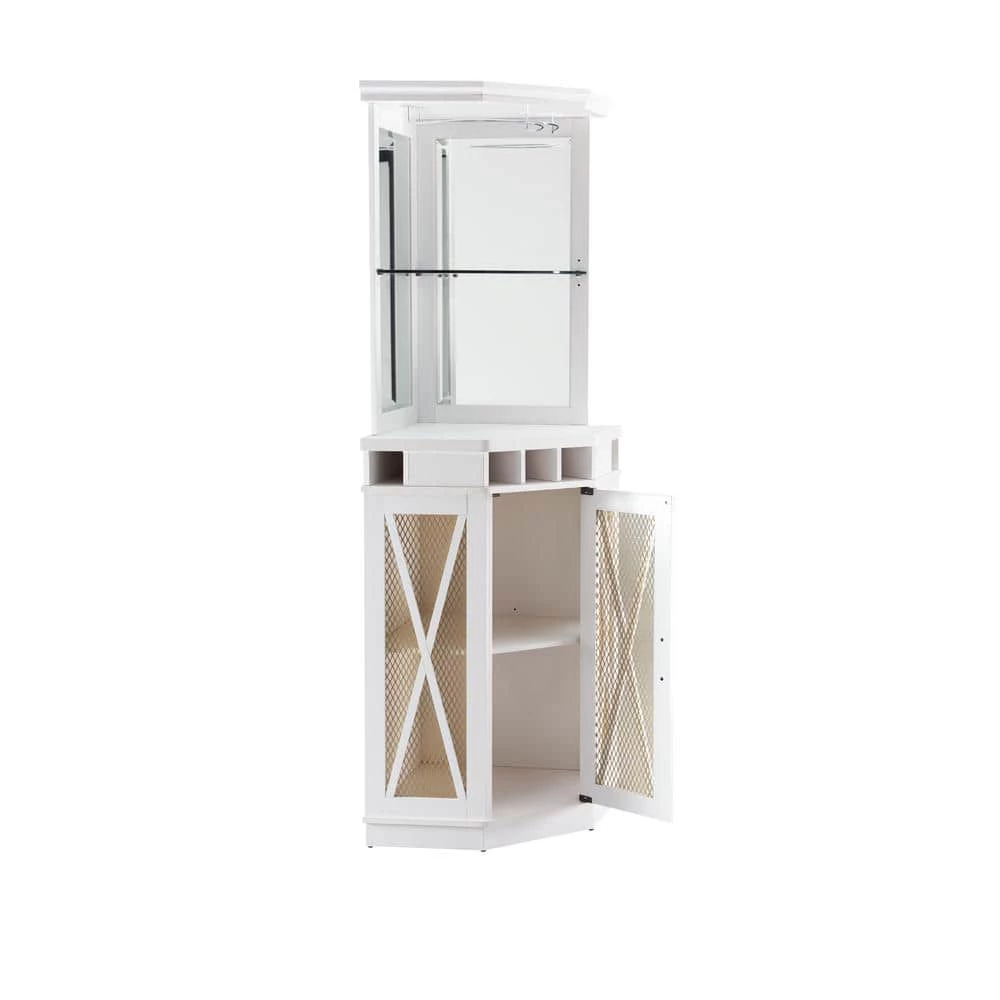Your next get together is going to be made even better with the Home Source Wash Grey Corner Bar Unit. It’s an all inclusive corner bar unit in a wasg grey finished hardwood frame. You won’t have to worry about where your stemware is going to go with the wrack on the top of this unit. Reflective mirrored panels are set behind the shelf. You can set more glasses or other accoutrements. The middle counter space is perfect for bottles or more wine glasses. The base of this unit features a mesh barn look door and 2 shelves for any other items you need to store. Make this your 1 stop shop for setting up hor’dourves plates and serving drinks. Store bottles in the wine middle wine rack that can house 5 bottles.