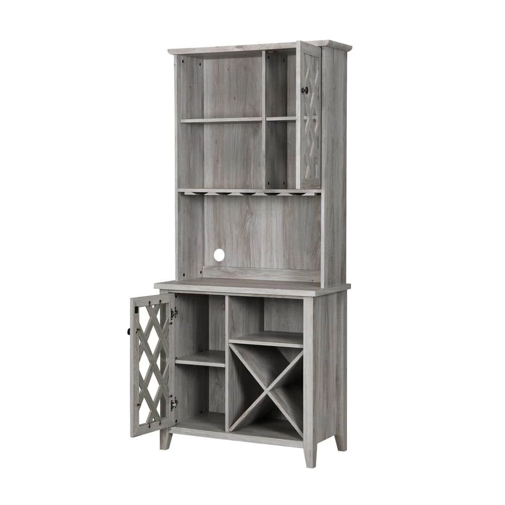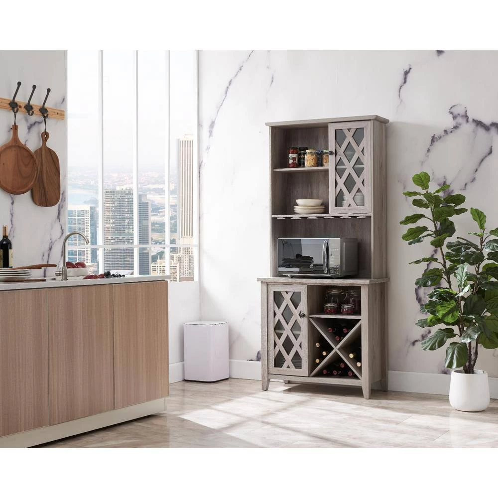 Upgrade your kitchen with this beautiful microwave stand and kitchen pantry from Home Source. Spacious enough to hold a large microwave, this unit doubles as a kitchen pantry with 2-closed cabinets, 3-open shelves and storage space for bottles. The grey, distressed finish matches any decor from rustic to elegant. Made of quality MDF and real wood. Assembly required.