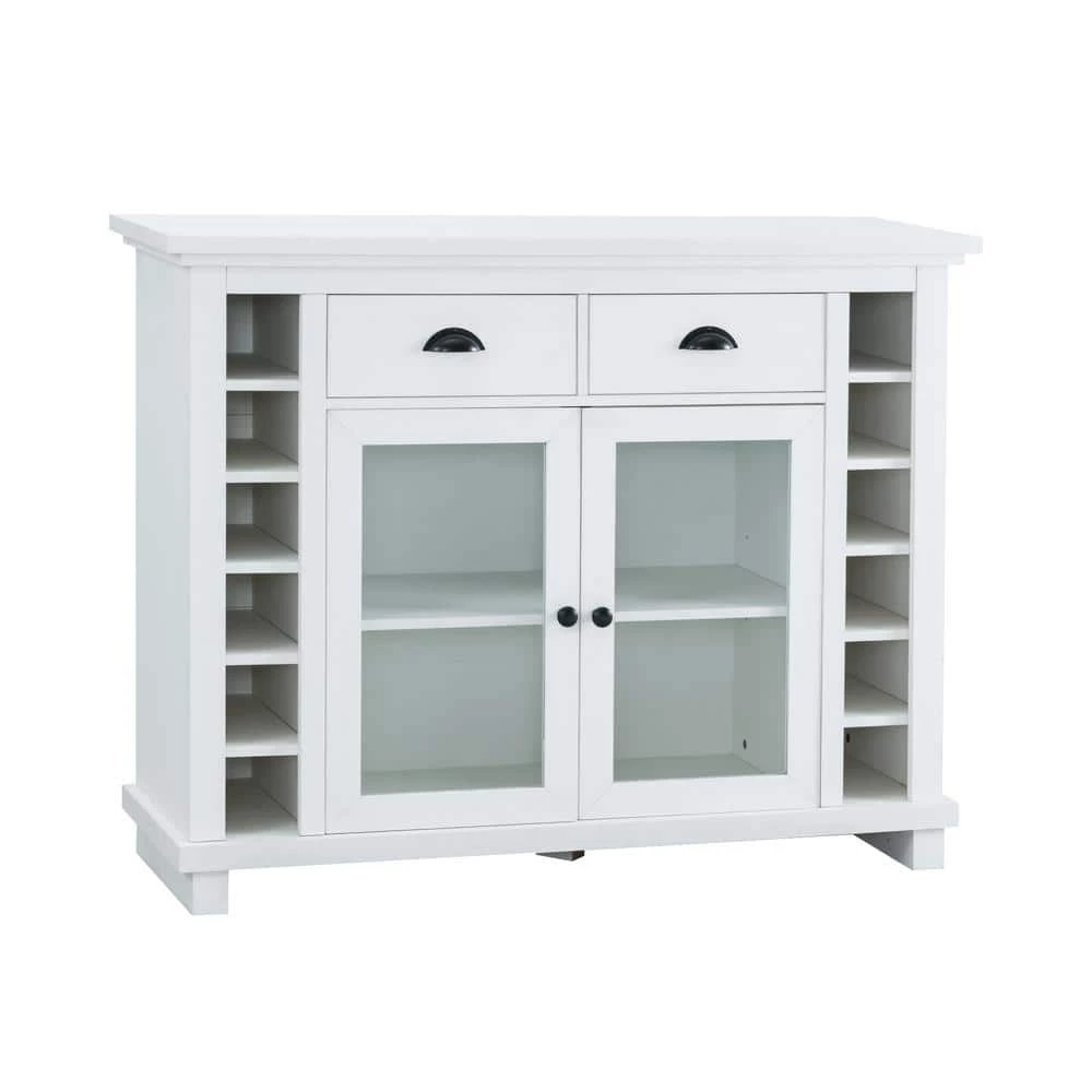 Combine elegant design with practicality with this beautiful multipurpose bar cabinet. You can also use it as a sideboard or server, which is ideal for displaying your China collection, family photos, or enjoying a fun weekend buffet. The glass doors provide you with the ideal space to display your favorite glassware, or a selection of drinks. There are 2-fabulous 7-bottle wine racks on the sides of this unit. If you want to maximize your living space but don’t want to sacrifice style, this white cabinet is an excellent choice.