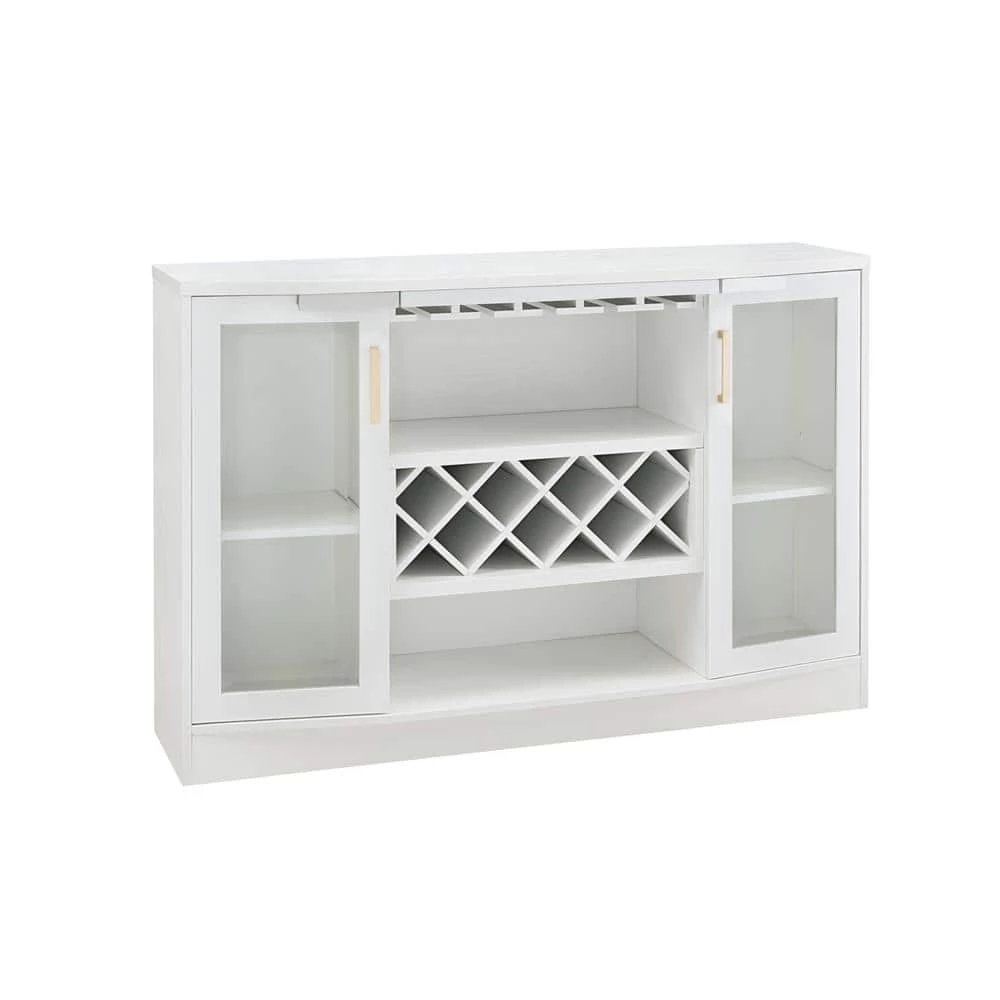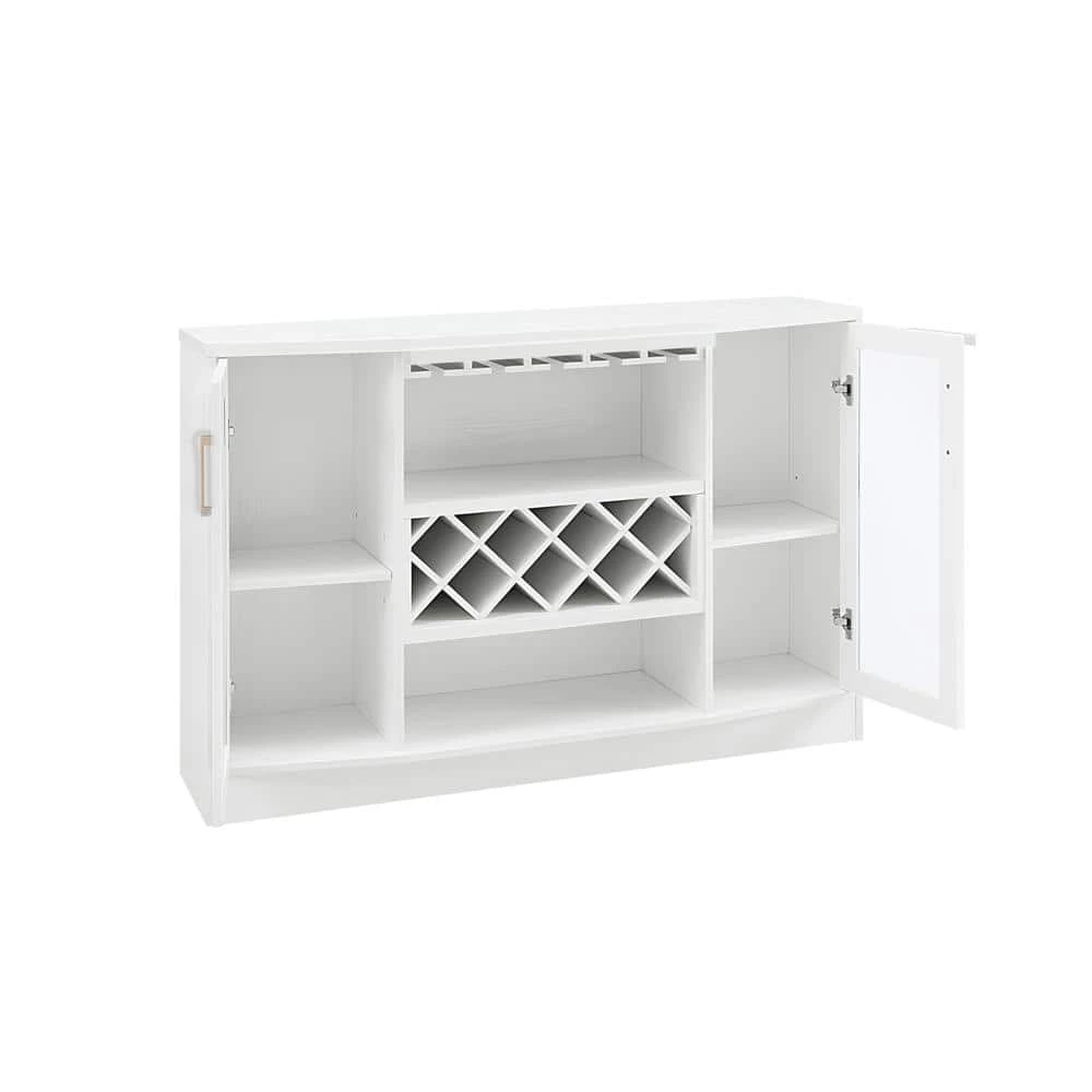 Elegant, distinctive and sophisticated all at the same time, this Jill Zarin bar cabinet adds a touch of class to any modern living room or dining room and will suit just about any type of decor. The sleek white finish gives the cabinet a stylish look and matches perfectly with the gold accent handles of the cupboards on both sides of this unit. The standout features are definitely the 7-bottle wine rack and the designated space to showcase your best stemware.