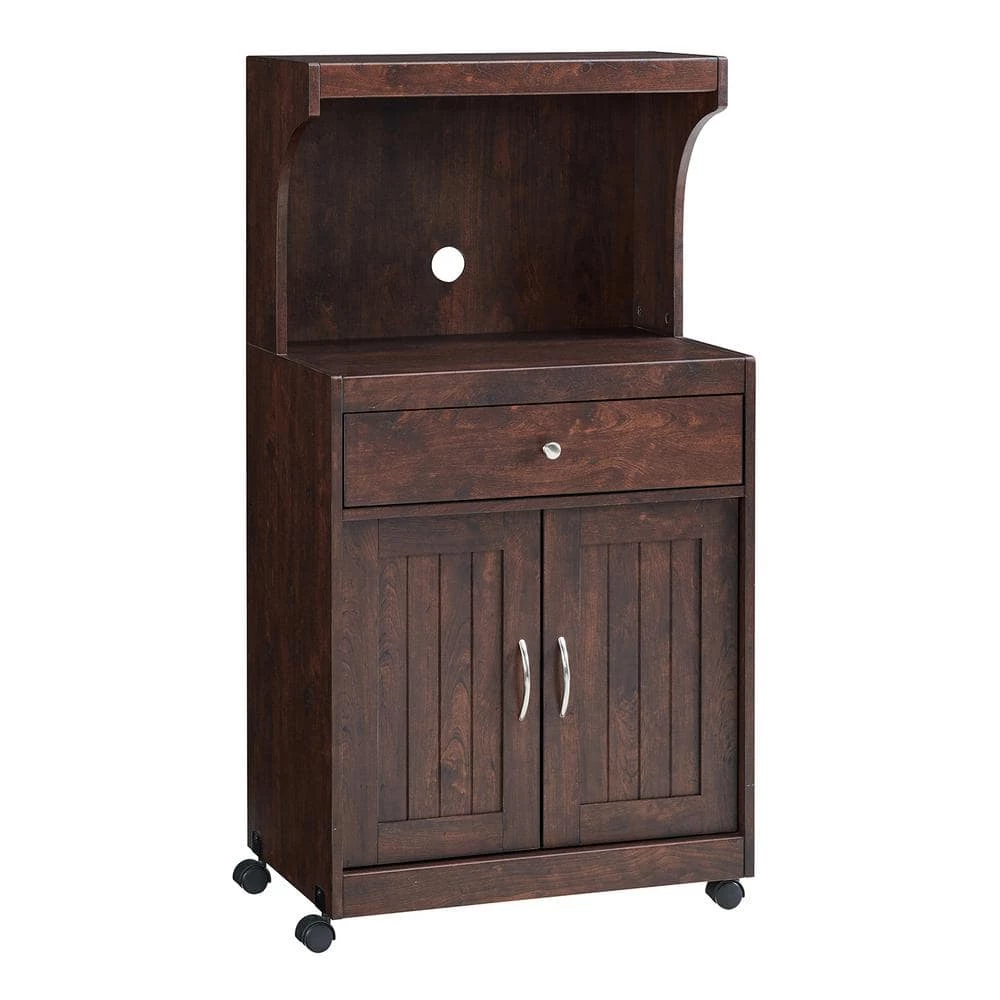 Equipped to provide ample storage and transitional design, the Home Source Mahogany Microwave Cart is the ultimate acquisition for your small kitchen space. The lower 1-shelf cabinet offers housing for pots, pans, dishes or dry goods while the centrally located drawer accommodates utensils and whatever miscellaneous paraphernalia that always seem to end up in the kitchen.’s counter top affords the ideal location for your microwave while the backdrop’s opening provides easy access to electrical outlets. Top shelf offers handy access to cookbooks and savory ingredients. Constructed on casters, the Home Source Mahogany Microwave Cart is outfitted for total mobility should the need arise.