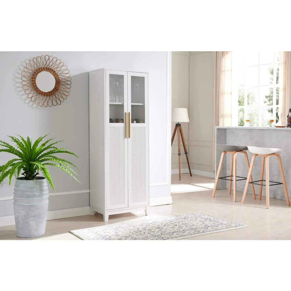 Stylish, sleek, and modern are just some adjectives that come to mind when describing this beautiful bar cabinet. Among its many features are its elegant glass, wooden doors which give you the option of concealing your wine and beverage collection or showcasing them. This cabinet can be used for storing ceramics, ornaments, or books. There is also a designated hanging space for your best glassware.