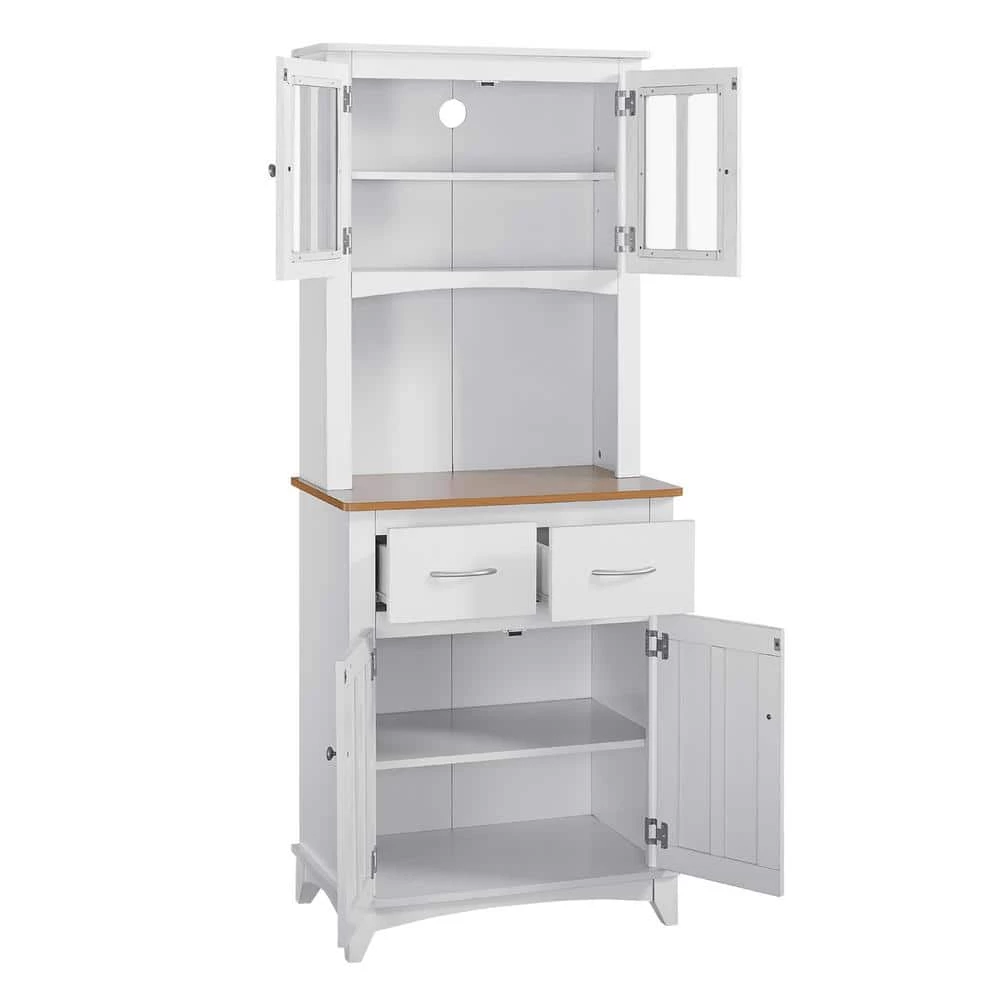 The Home Source White and Cherry Tall Microwave Cart with Storage is a beautiful country kitchen storage option with a restoration twist. Finished in white with a cherry microwave counter surface, this otherwise country styled kitchen storage piece is accented with a more contemporary nickel hardware. The upper glass paneled 1-shelf cabinet is ideal for either storage or display and the microwave compartment is complete with cut-out for easy electrical access. The 2-middle drawers are perfect as a catch-all for your arsenal of kitchen paraphernalia. And last, but definitely not least, the’s lower paneled 1-shelf cabinet acts as the perfect mini pantry. The Home Source White and Cherry Tall Microwave Cart with Storage is the quintessential storage solution for the more updated country kitchen.