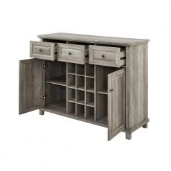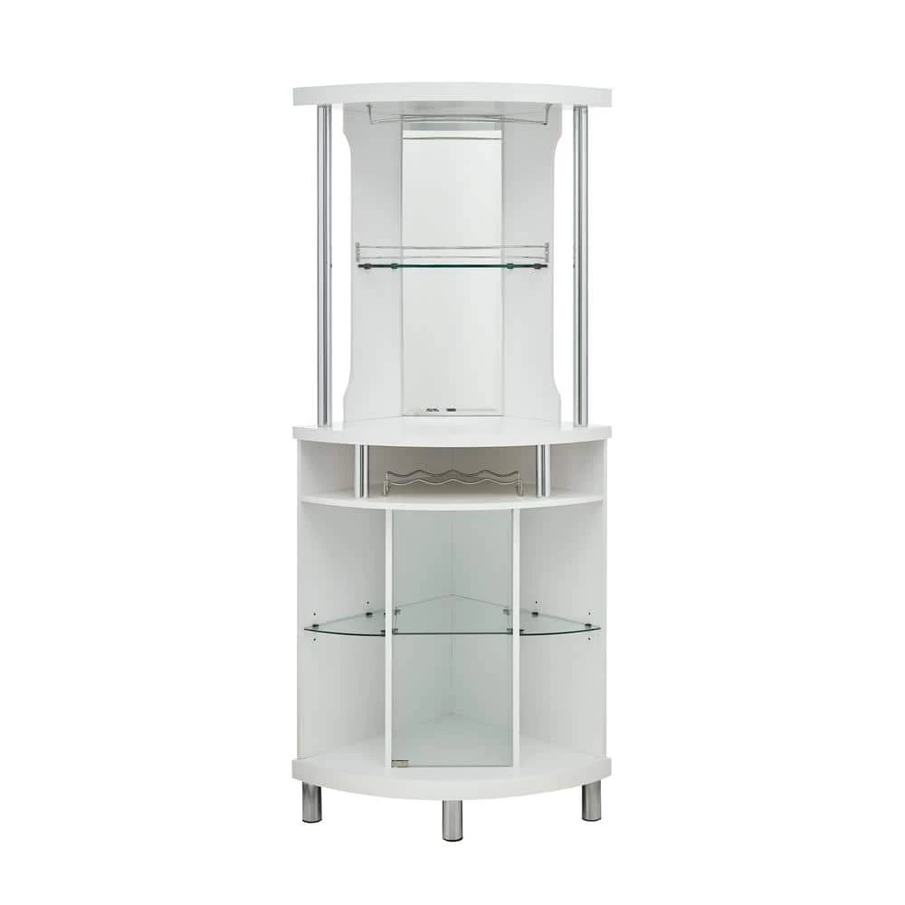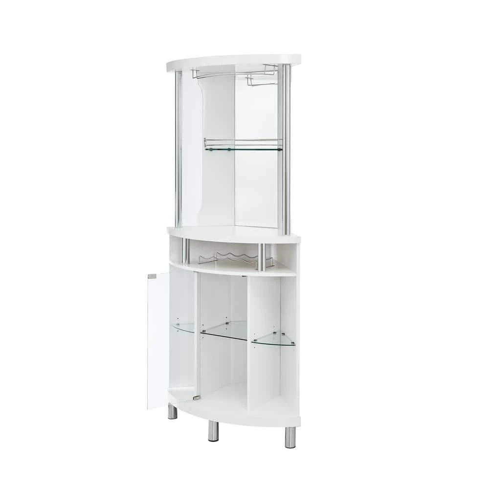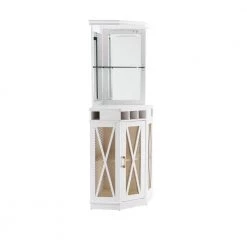 Your next get-together is going to be made even better with the Home Source Corner Bar Unit. It’s an all inclusive corner bar unit in a concrete finished hardwood frame. You won’t have to worry about where your stemware is going to go with the rack on the top and middle of this unit. Reflective mirrored panels are set behind these racks. The middle counter space is perfect for bottles or more wine glasses. 2-silver chrome bars add sturdy support to the top of the unit. The base of this unit features 1-clear glass door for the middle shelves and 2-side shelves for any other items you need to store. Make this your 1-stop shop for setting up hor’dourves plates and serving drinks. Store bottles in the middle wine rack that can house 4-bottles.