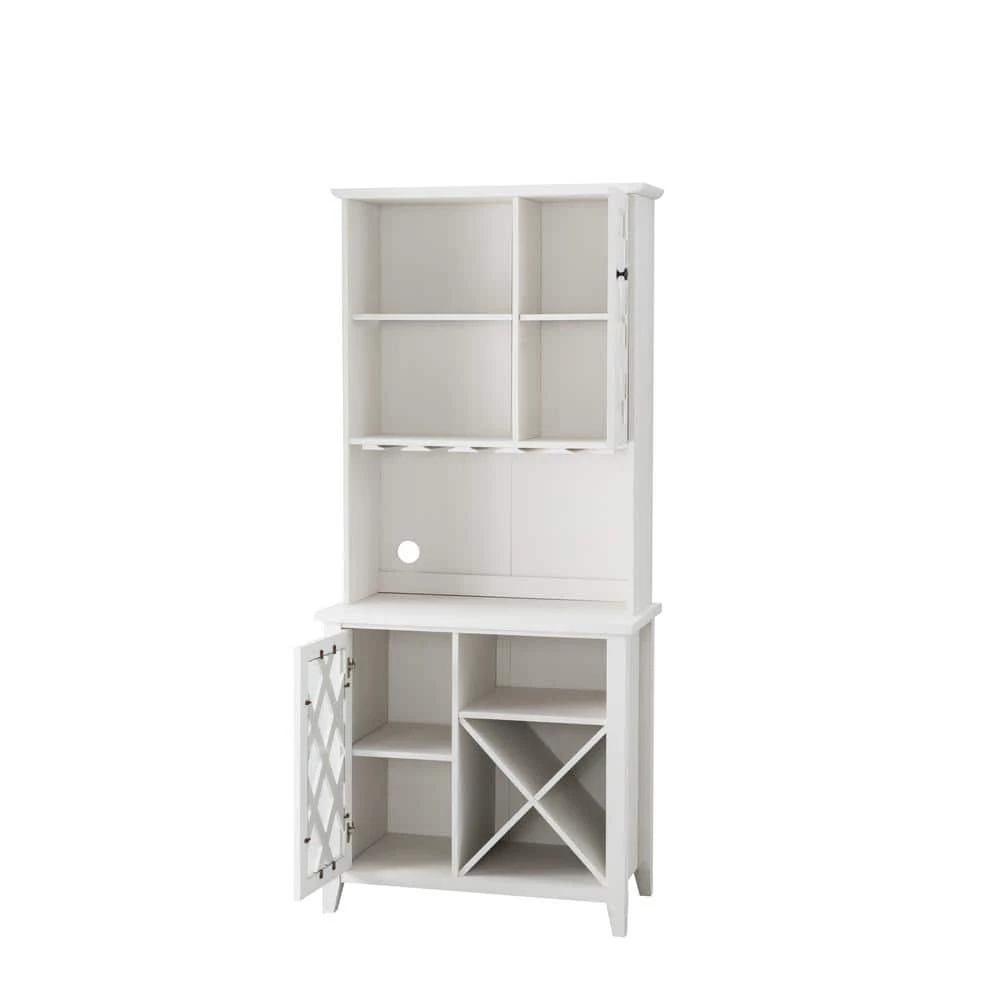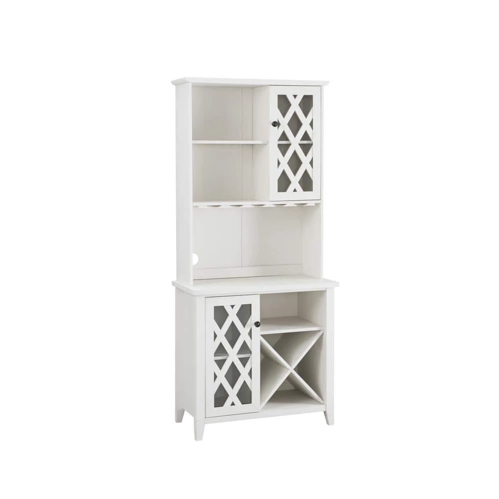 Upgrade your kitchen with this beautiful microwave stand and kitchen pantry from Home Source. Spacious enough to hold a large microwave, this unit doubles as a kitchen pantry with 2-closed cabinets, 3-open shelves and storage space for bottles. The white, distressed finish matches any decor from rustic to elegant. Made of quality MDF and real wood. Assembly required.