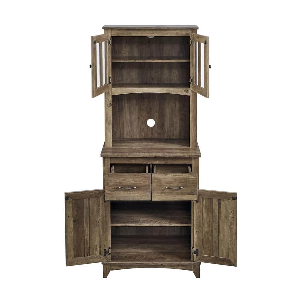The Home Source Tall Microwave Cart with Storage is a beautiful country kitchen storage option with a restoration twist. Finished in reclaimed barn wood Look microwave counter surface, this otherwise country styled kitchen storage piece is accented with a more contemporary nickel hardware. The upper glass paneled one shelf cabinet is ideal for either storage or display and the microwave compartment is complete with cut-out for easy electrical access. The two middle drawers are perfect as a catch-all for your arsenal of kitchen paraphernalia. And last, but definitely not least, this lower paneled one shelf cabinet acts as the perfect mini pantry. The Home Source Tall Microwave Cart with Storage is the quintessential storage solution for the more updated country kitchen.