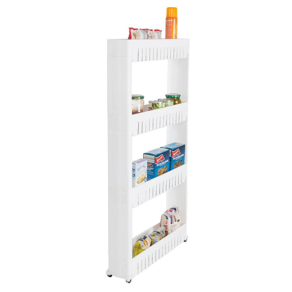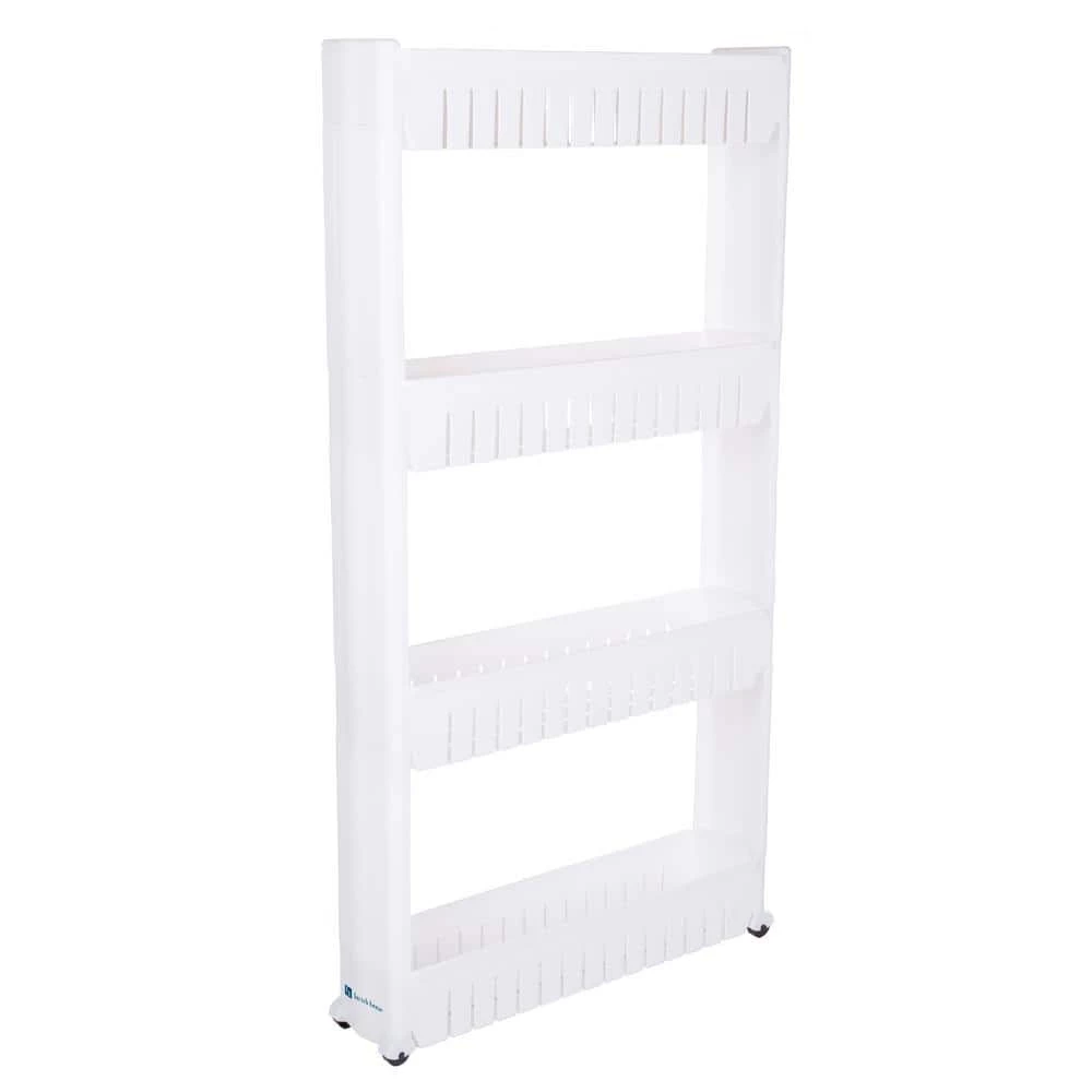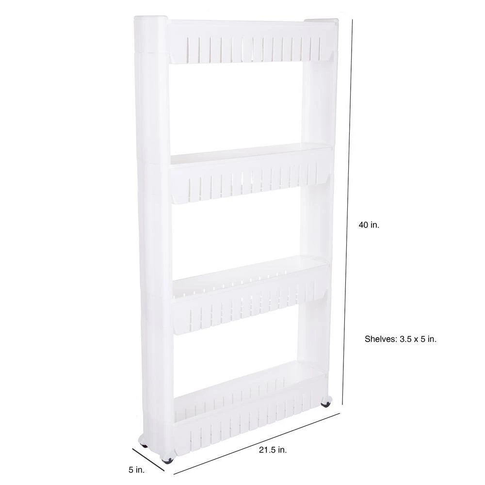The Slim Slide Out Storage Tower by Lavish Home features four shelves that create additional storage in an area with limited space. The slim design is ideal for narrow spaces in the kitchen, laundry room, bathroom, garage and more. The five inch wide shelves are perfect for squeezing into tight spaces like next to the refrigerator or in between your washer and dryer. This storage tower is very sturdy, easy to clean and easy to assemble. PVC wheels make the tower glide effortlessly to allow for easy access.