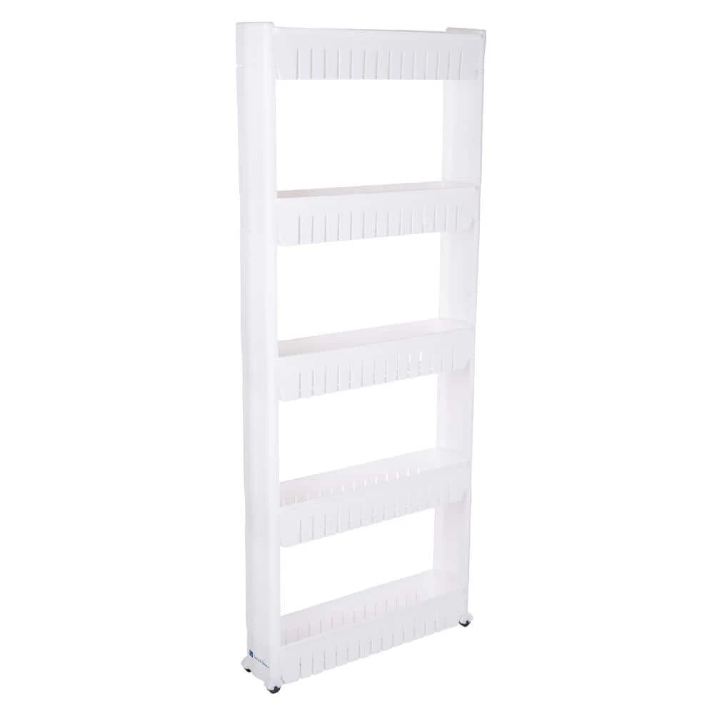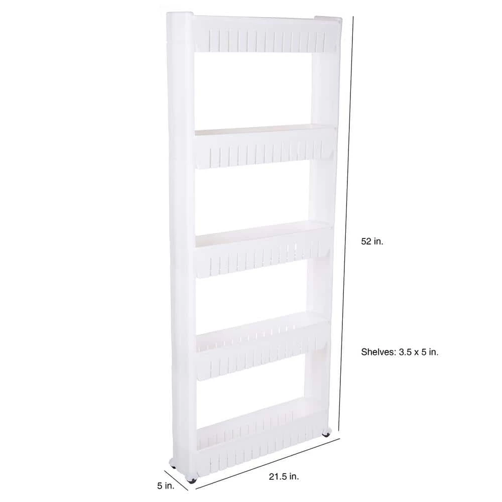 The Slim Slide Out Storage Tower by Lavish Home features five shelves that create additional storage in an area with limited space. The slim design is ideal for narrow spaces in the kitchen, laundry room, bathroom, garage and more. The 5 inch wide shelves are perfect for squeezing into tight spaces like next to the refrigerator or in between your washer and dryer. This storage tower is very sturdy, easy to clean and easy to assemble. PVC wheels make the tower glide effortlessly to allow for easy access.