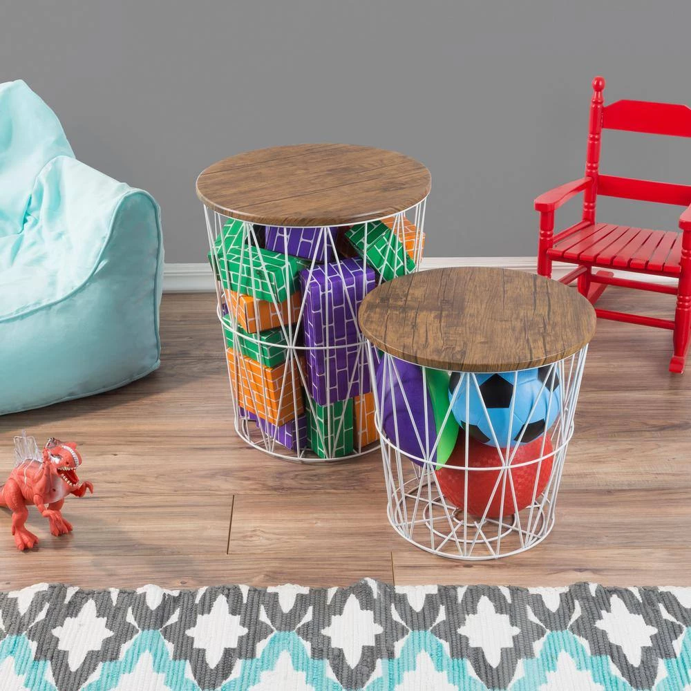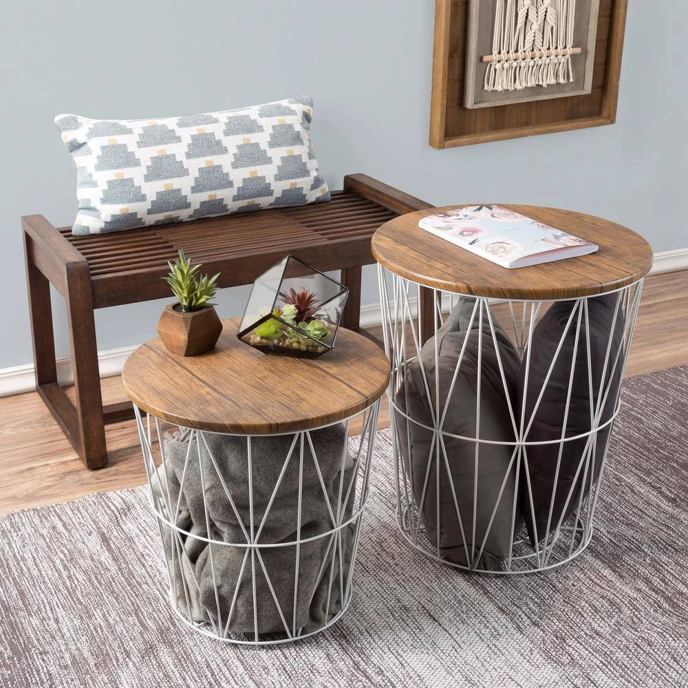 Easily enhance your decor while gaining a practical storage solution with the 2-Piece Nesting Veneer Metal and Wood Round Accent Table Set by Lavish Home. The two decorative end tables are designed to offer an effective storage option to any living room, bedroom, office or small space and act as functional alternative to traditional end tables. The accent tables feature a removeable wooden lid and storage basket to keep books, blankets, board games, toys and more. The beautiful square grid pattern metal wire basket paired with the wood grain look on the veneer lid can instantly upgrade your space and perfectly complement any rustic, modern, farmhouse, vintage or industrial decor.