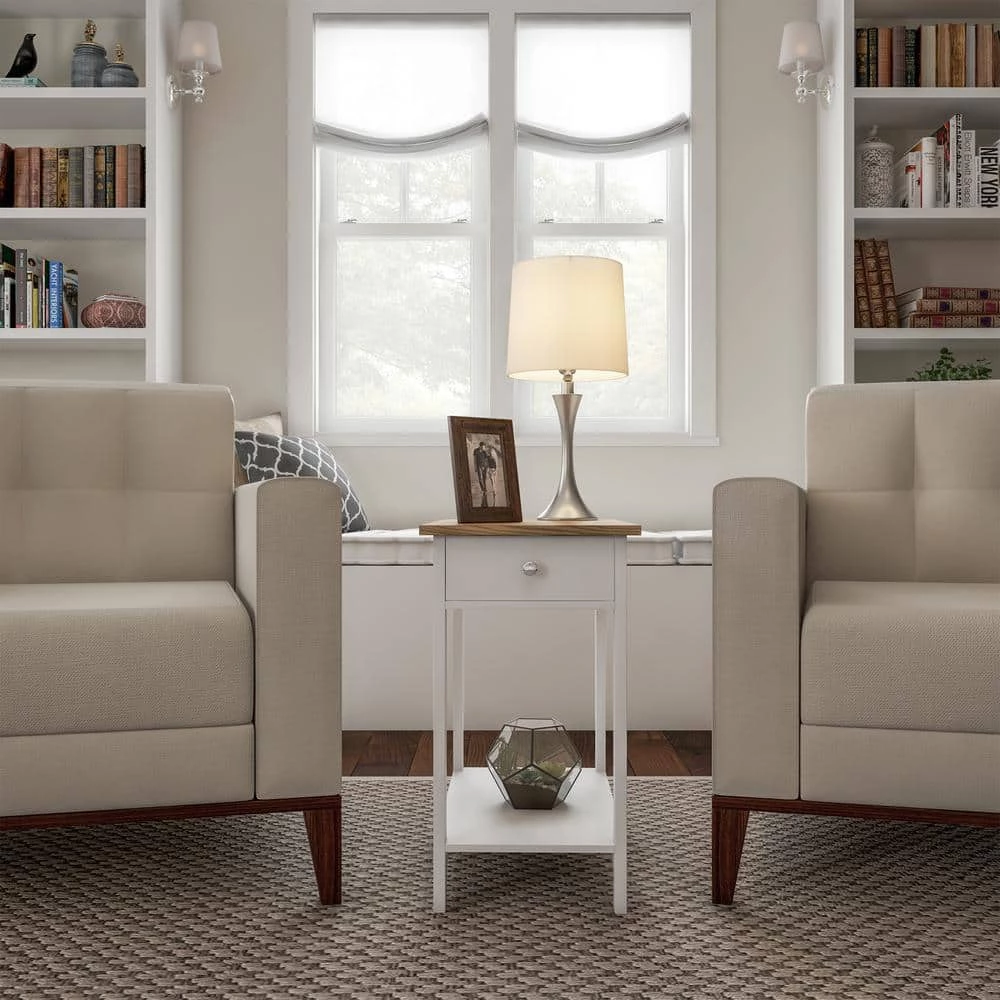This narrow Side Table with Drawer by is a beautiful and practical addition to your home decor. Blending traditional style and functionality, this rectangular side table features a slim profile that is ideal for small spaces like hallways, foyers and entryways, or beside your favorite chair. This two-toned end table has a sturdy manufactured wood base with a lower storage shelf and a pull-out drawer painted in a classic white. The top of this accent table has a honey oak veneer for a modern farmhouse appeal. This versatile side table is great for displaying a pretty plant or picture frame in the living room, as a spot to set a snack plate and a coffee cup, or as a nightstand in your bedroom.