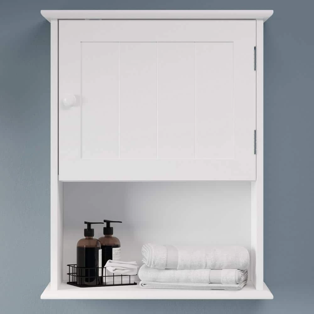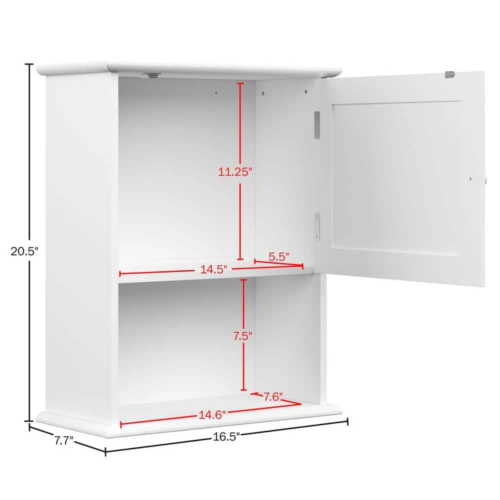 The Wall-Mounted Storage Cabinet by Lavish Home is a stylish and space-saving addition to any room. This 16.5-inch-long bathroom, laundry room, or kitchen cabinet combines a closed cupboard with an open lower shelf to create compact wall-mounted storage that’s perfect for apartments and small homes. This versatile bathroom wall cabinet allows you to display decor items while stashing toiletries, cleaning supplies, and medicines out of sight. Constructed of engineered wood with a soft white finish, this medicine cabinet will add attractive storage to your home for years to come.